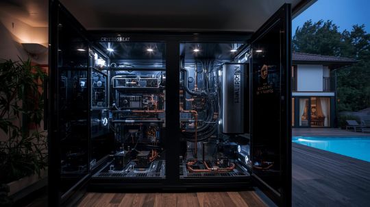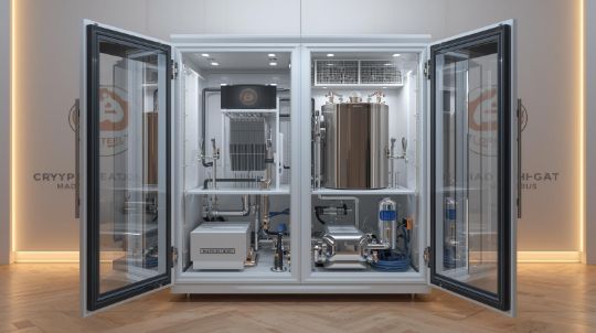 Нагрев котла осуществляется каскадом теплообменника технологии "сухого нагрева" и приборов для майнинга с водяным охлаждением. Котел оснащен 2-мя циркуляционными насосами с электронным регулированием для независимой работы теплообменника и приборов для майнинга. Встроенный смесительный трехходовой клапан с сервоприводом позволяет точно настраивать температуру обратки приборов для майнинг. Встроена группа безопасности и клапан автоматической подпитки, так же для защиты теплообменников приборов для майнинга - встроен паяный пластинчатый теплообменник. Встроена группа безопасности и расширительный бак. Запорная арматура и резьбовые фитинги изготовлены из латуни. Трубопровод реализован пресс-системой из нержавеющей стали. Управление работой котла, а также подключаемой системой отопления осуществляется универсальным, свободно программируемым контроллером.
